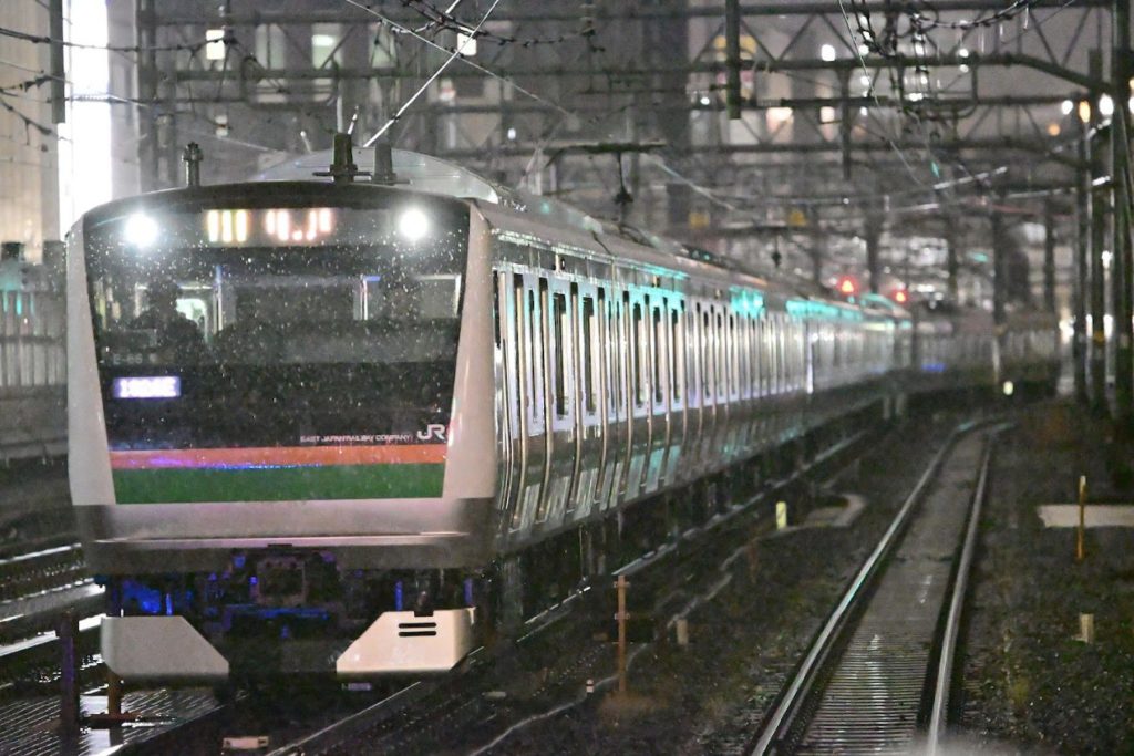 続いて雨の作例を。闇鉄では、昼と違い明るさを確保することが重要になってきます。なのでこの雨の場合、ノイズザラザラでもいいので(今の時代現像の時にAIノイズ除去を使える為)、後ろに下がり(濡れるから)望遠を飛ばして撮る方がいいと思います。また広角で撮ると、この撮影地はSSを上げるのが困難な為、ブレる可能性があるのです。